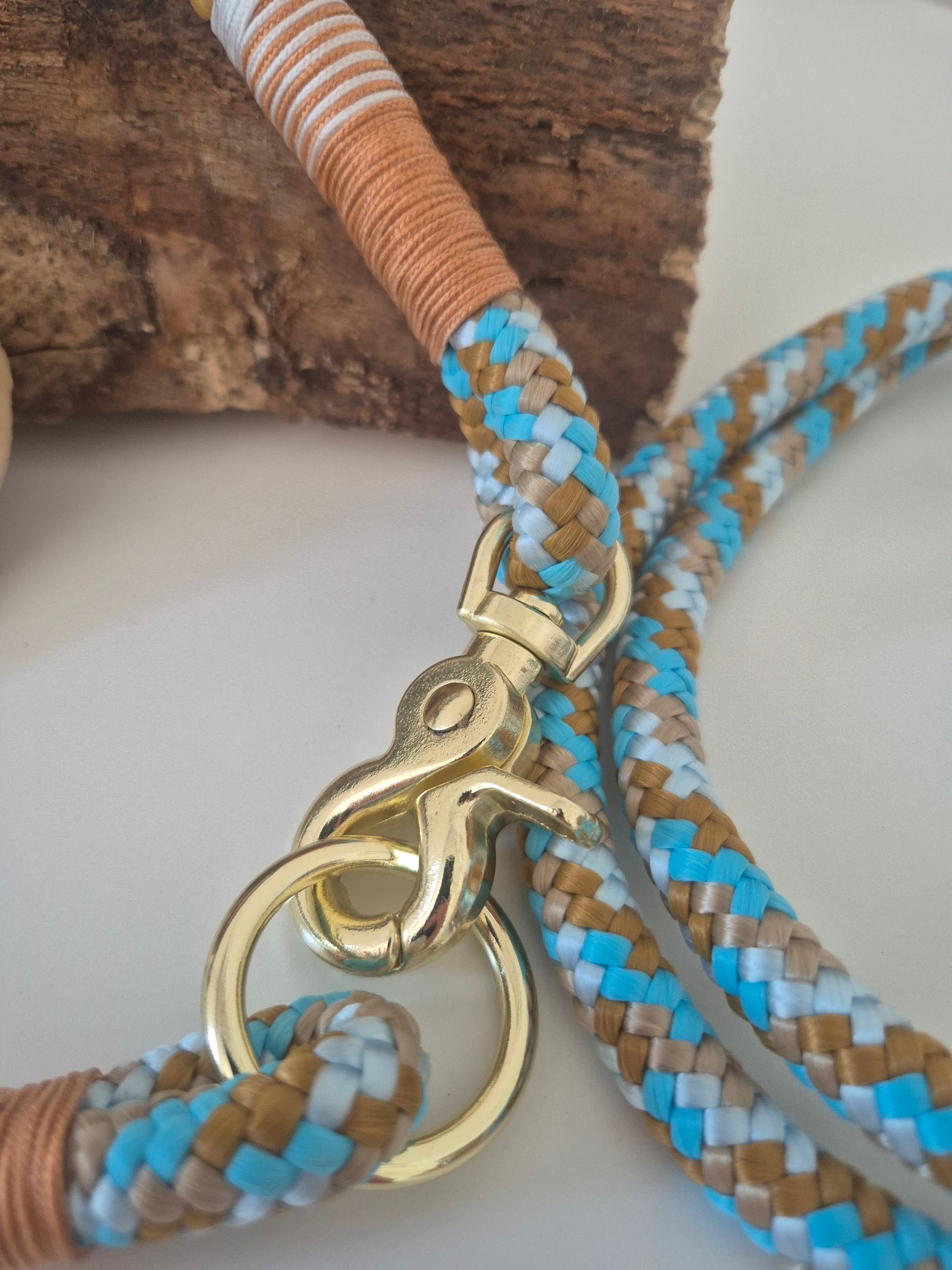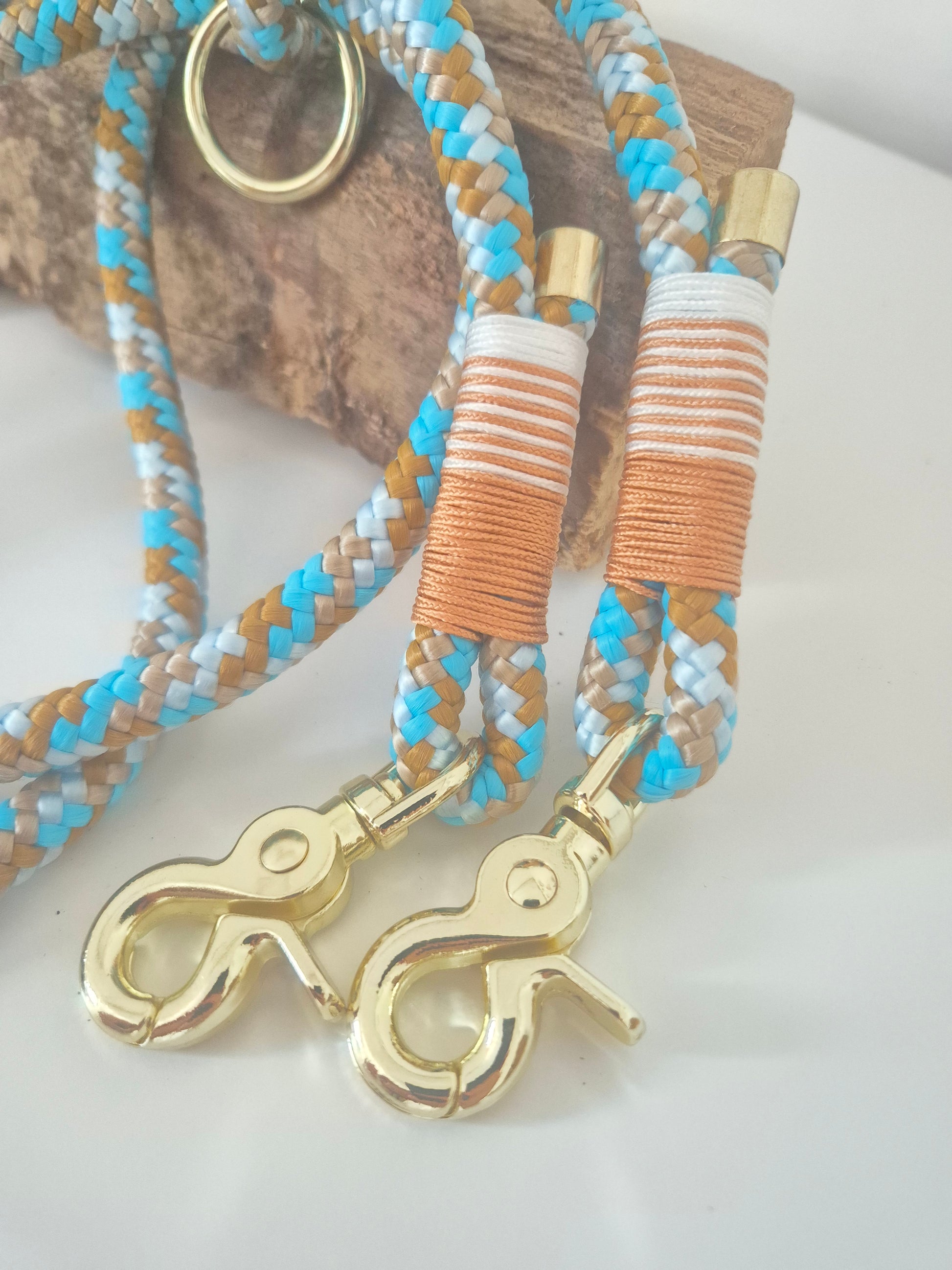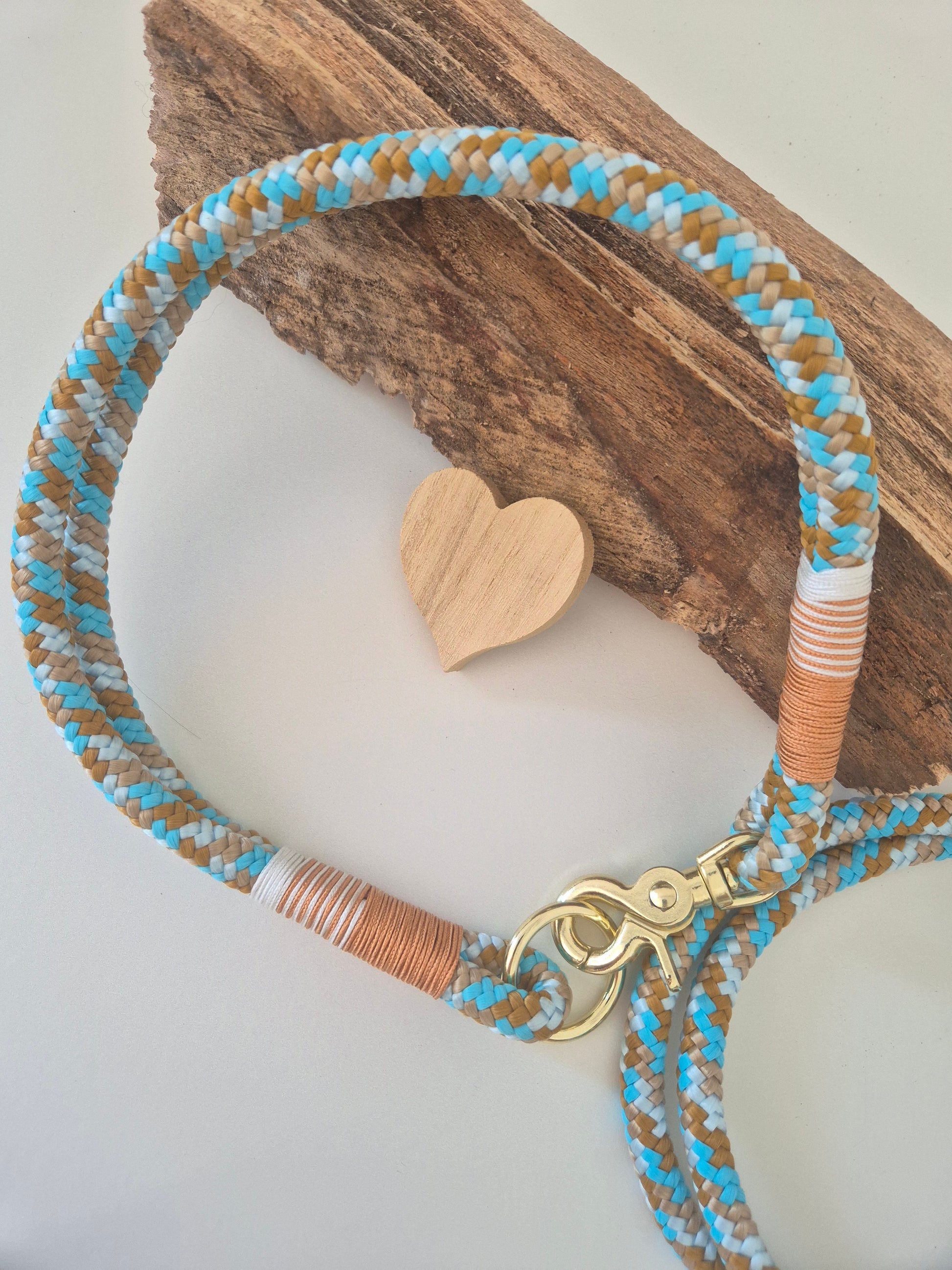 Das Set besteht aus Leine und Halsband aus Tauseil. Tau ist schön leicht und bietet dir und deinem Hund ein angenehmes Tragegefühl. Die dargestellte Leine ist 2,20 m - 2,30 m lang und lässt sich 3fach verstellen: