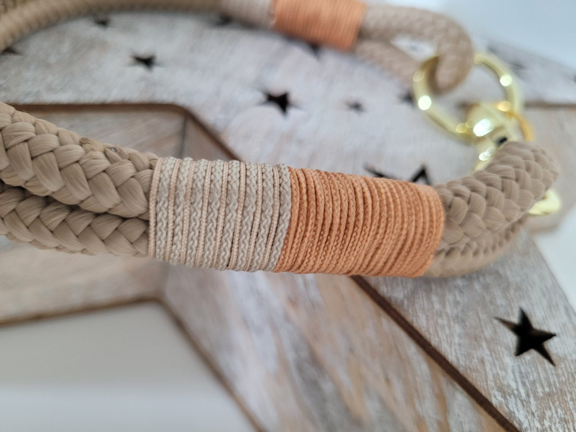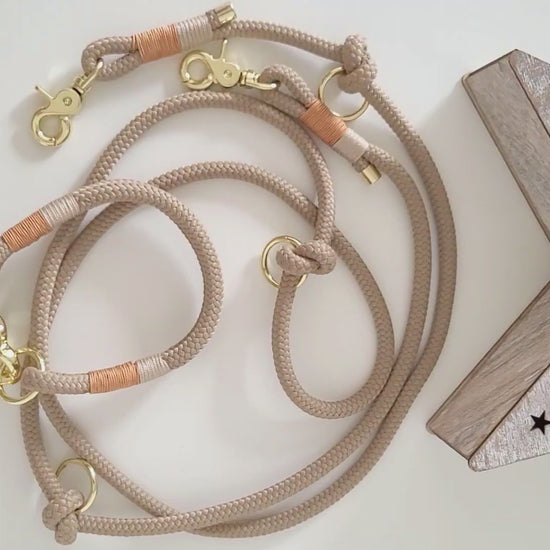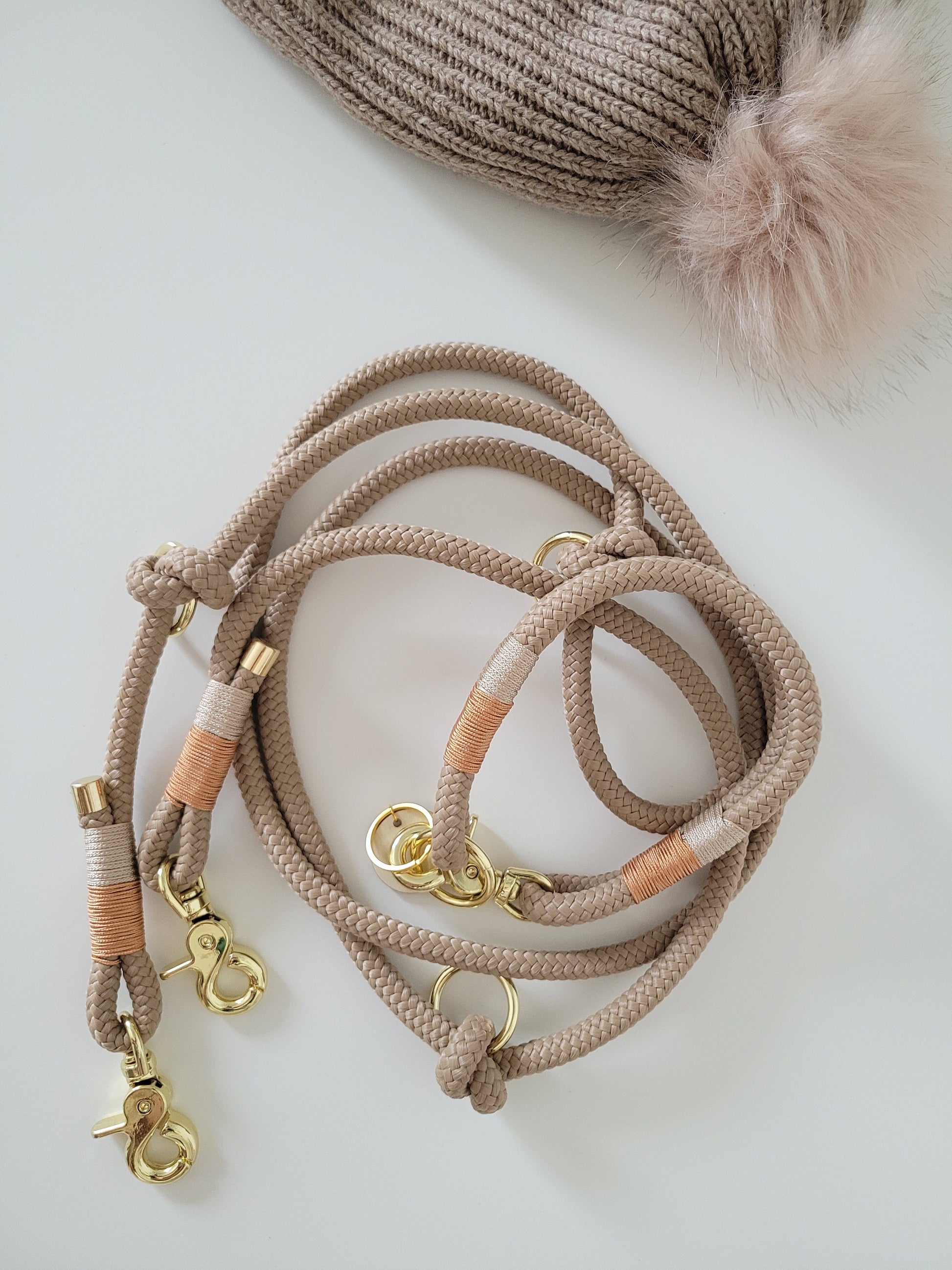 Das Set besteht aus Leine und Halsband aus Tauseil. Tau ist schön leicht und bietet dir und deinem Hund ein angenehmes Tragegefühl. Die dargestellte Leine ist 2,20 m - 2,30 m lang und lässt sich 3fach verstellen: