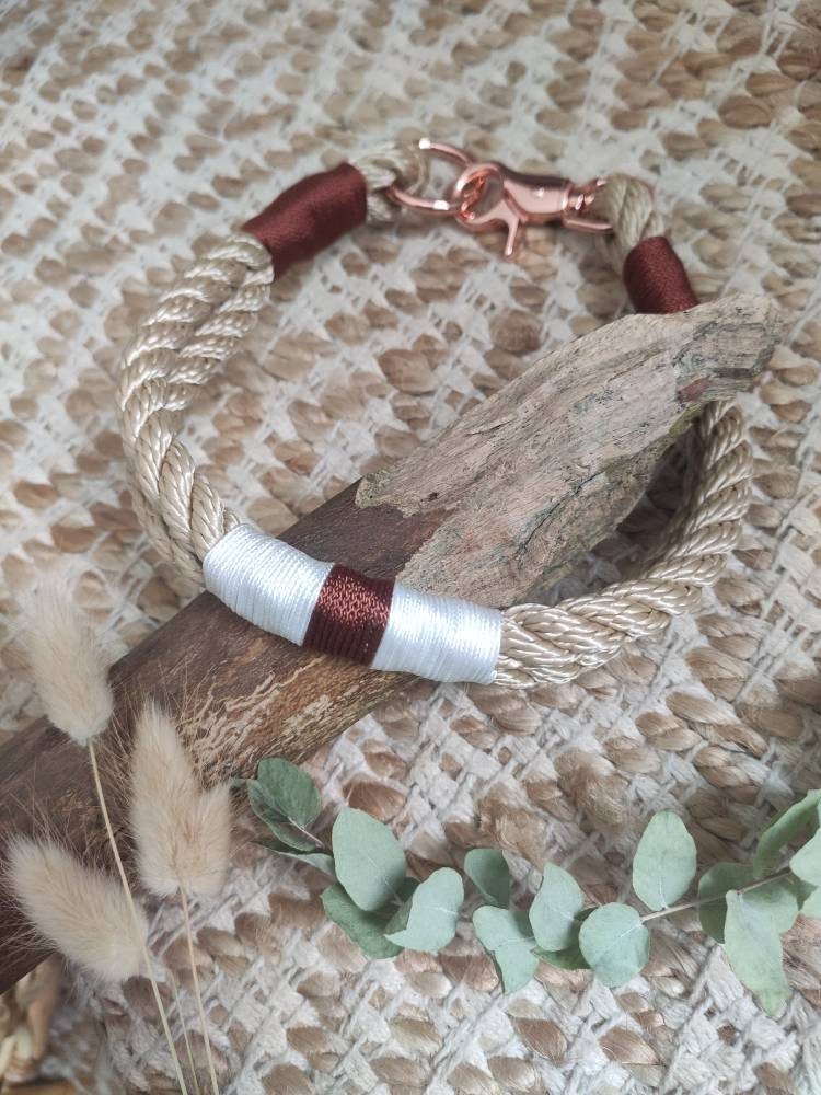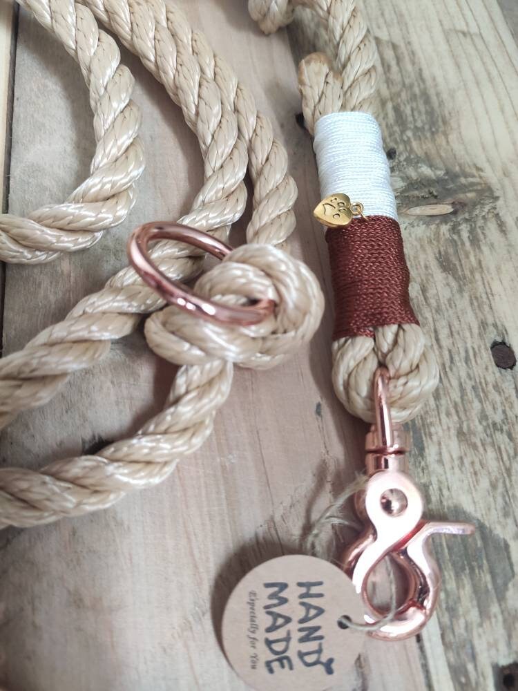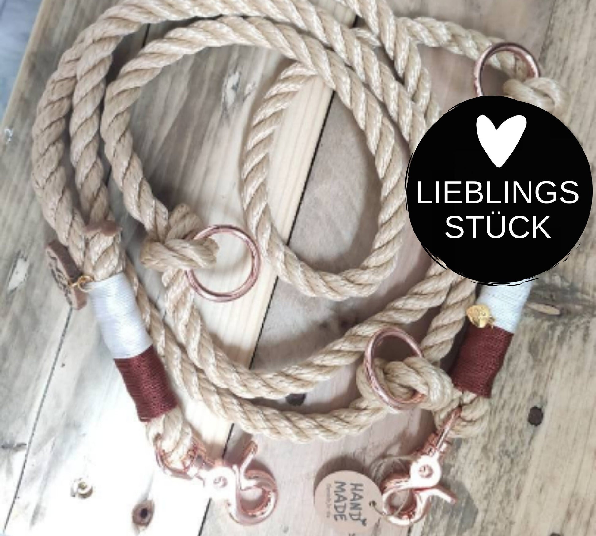Das Set besteht aus Leine und Halsband aus Tauseil. Tau ist schön leicht und bietet dir und deinem Hund ein angenehmes Tragegefühl. Die dargestellte Leine ist 2,20 m - 2,30 m lang und lässt sich 3fach verstellen: