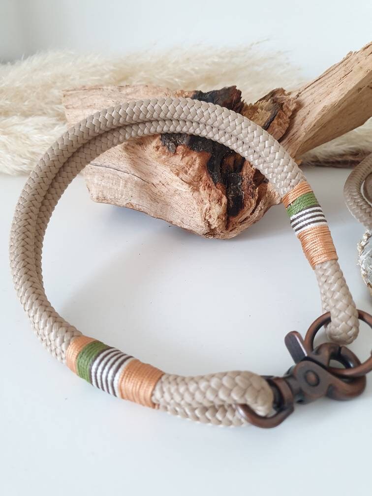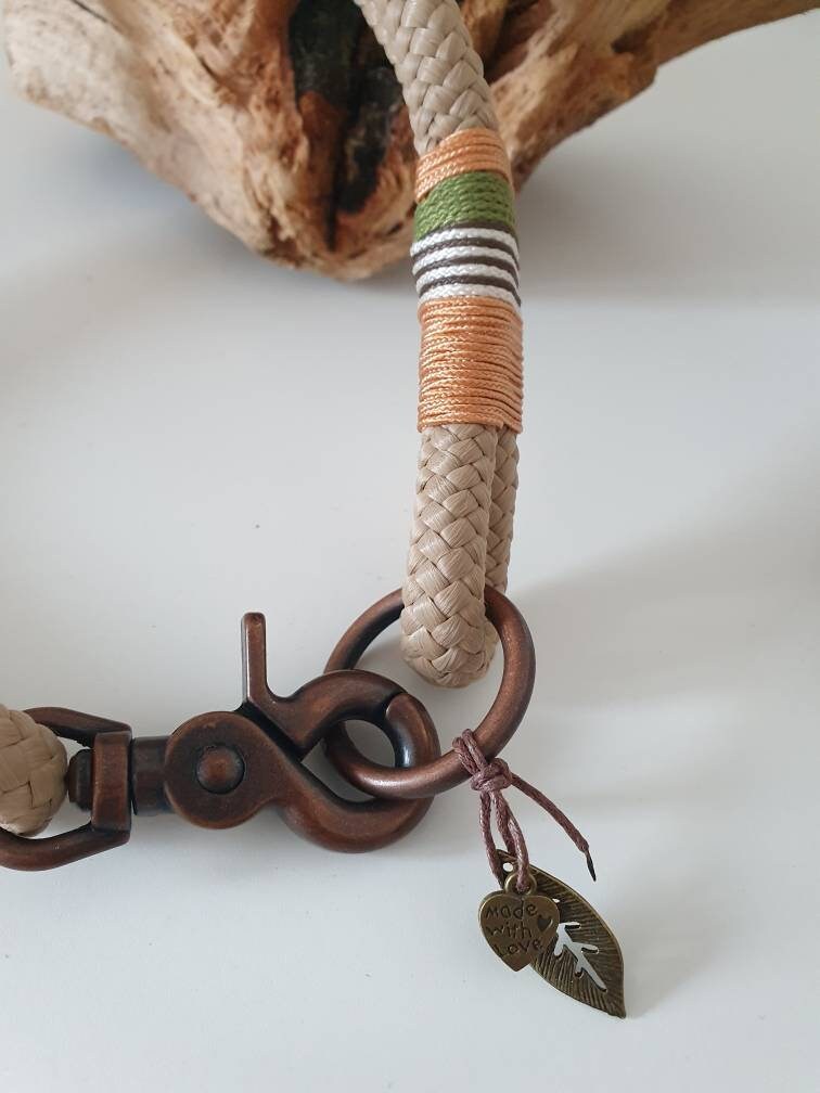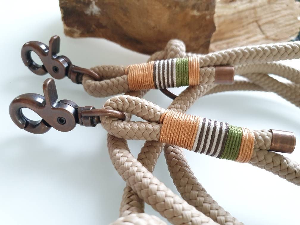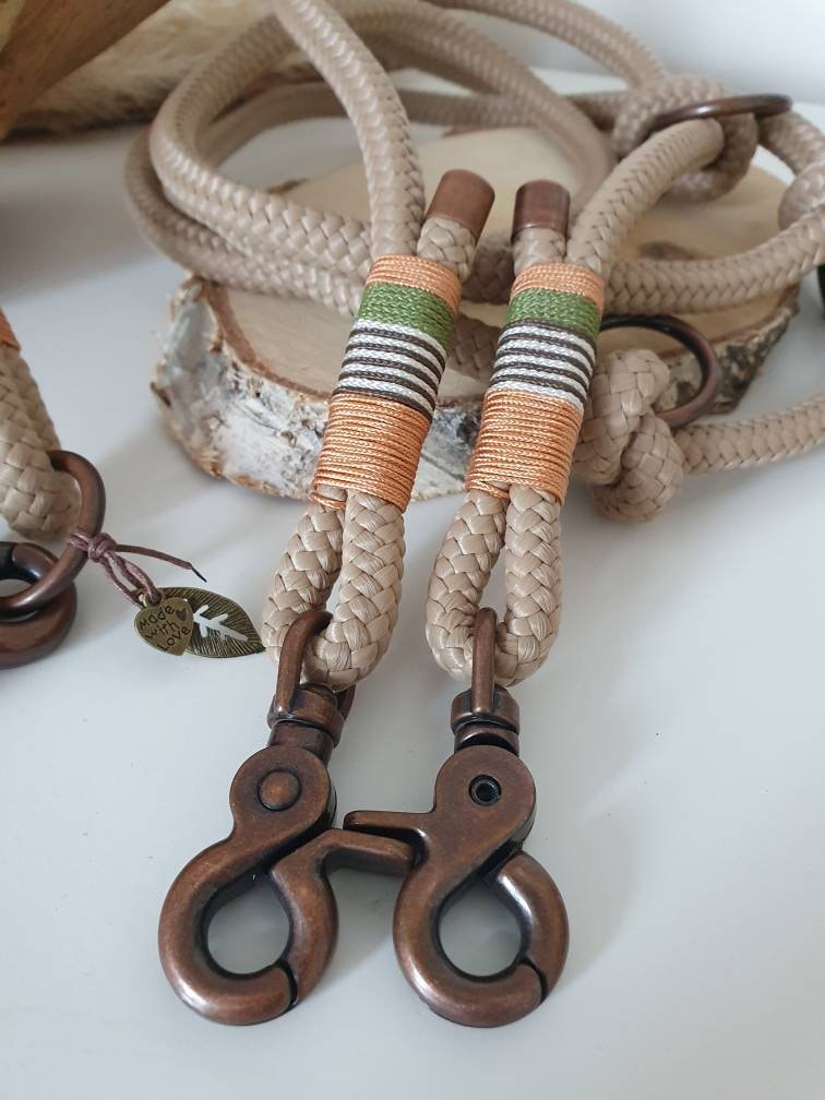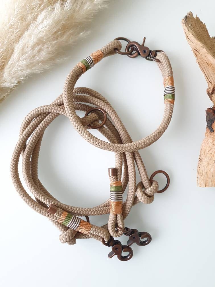 Das Set besteht aus Leine und Halsband aus Tauseil. Tau ist schön leicht und bietet dir und deinem Hund ein angenehmes Tragegefühl. Die dargestellte Leine ist 2,20 m - 2,30 m lang und lässt sich 3fach verstellen: