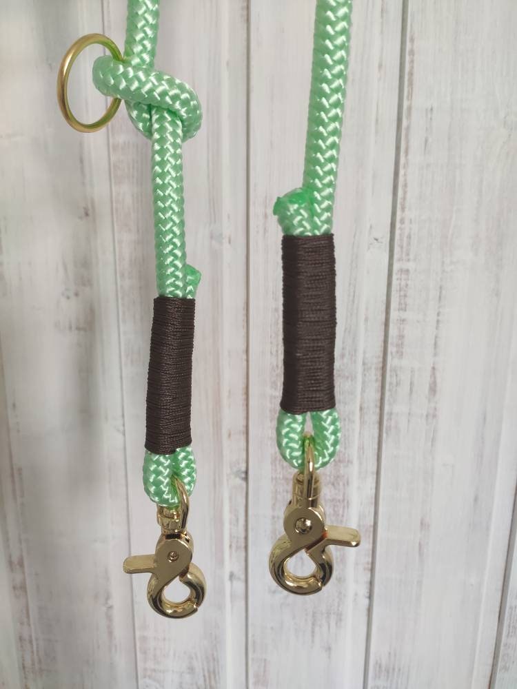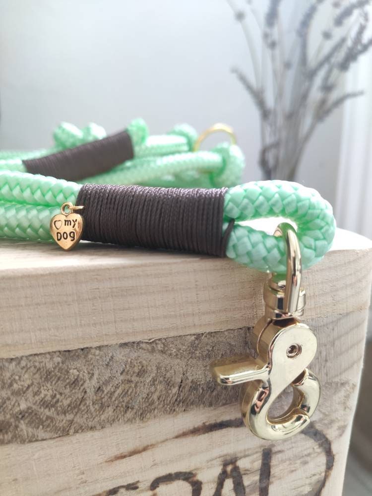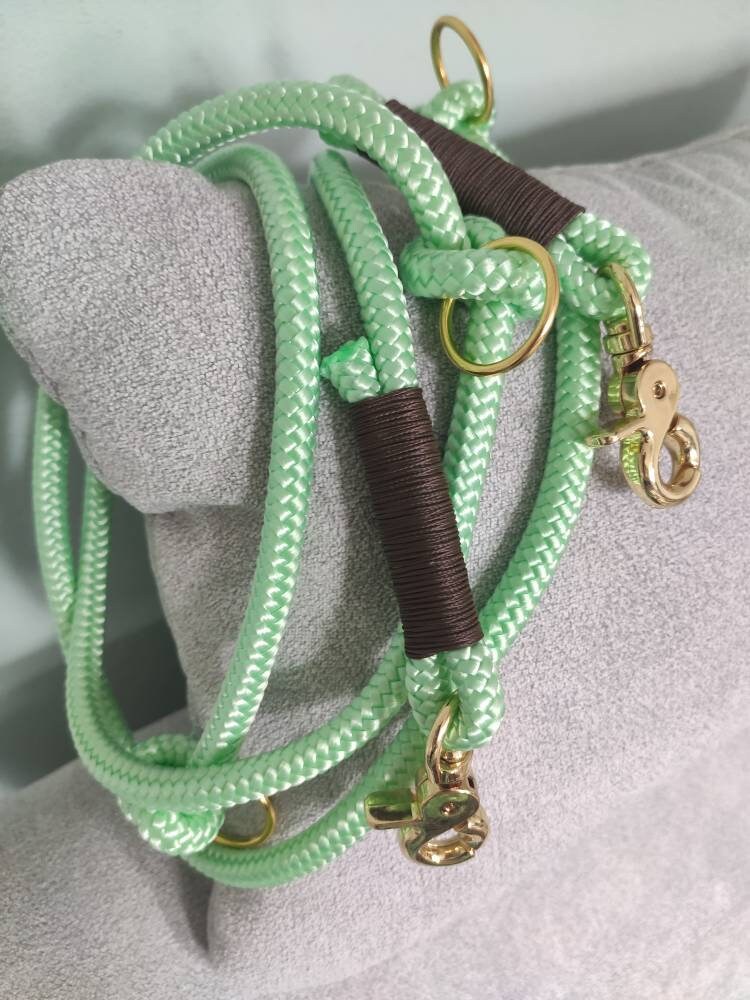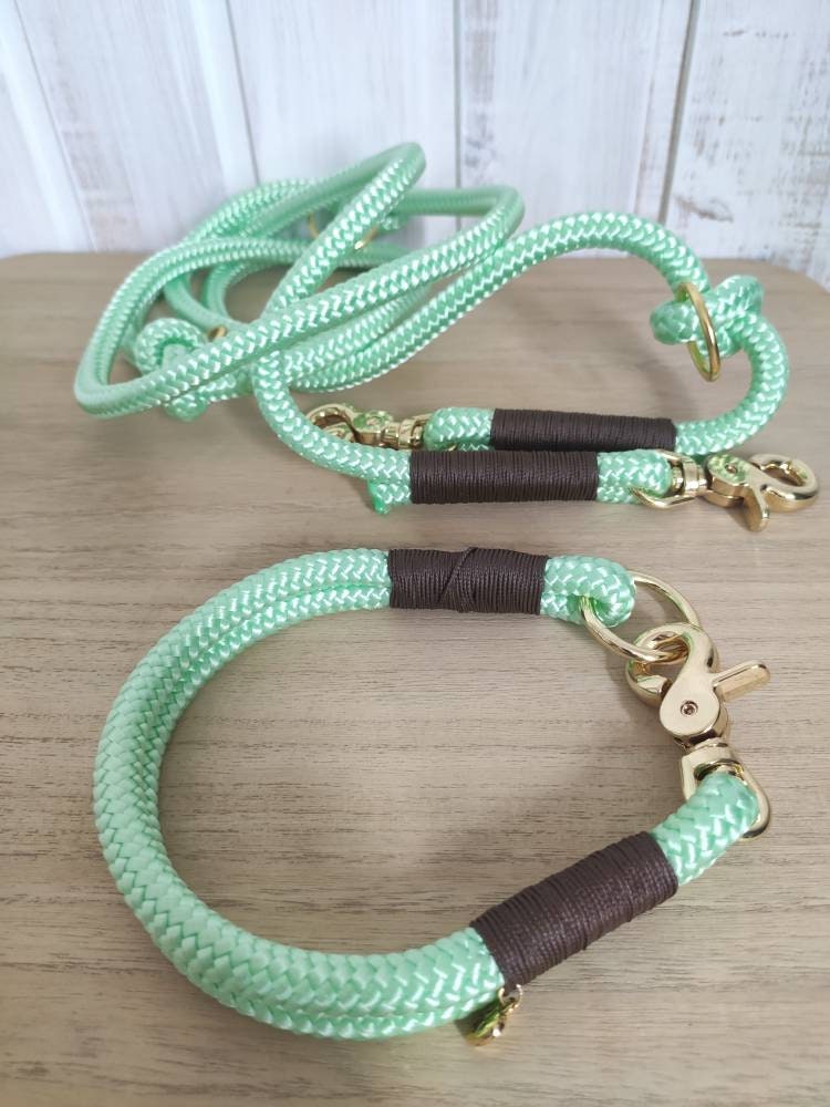 Das Set besteht aus Leine und Halsband aus Tauseil. Tau ist schön leicht und bietet dir und deinem Hund ein angenehmes Tragegefühl. Die dargestellte Leine ist 2,20 m - 2,30 m lang und lässt sich 3fach verstellen: