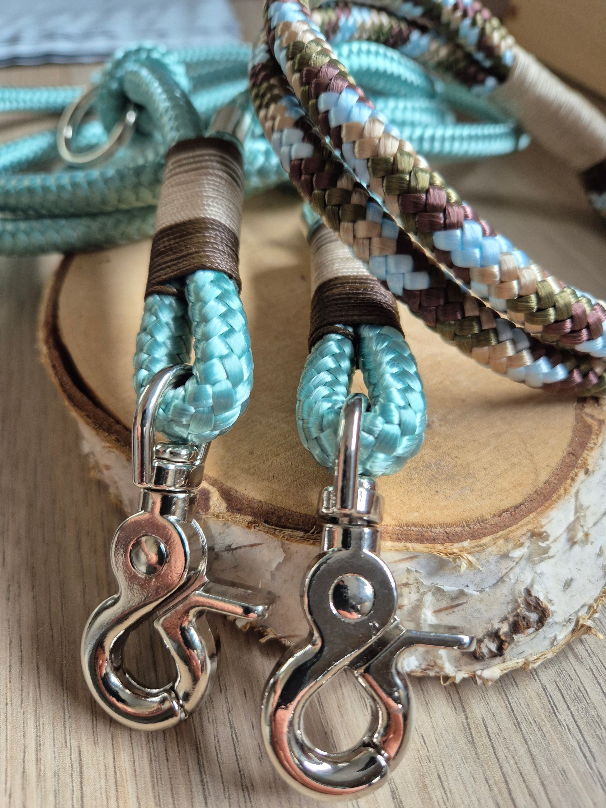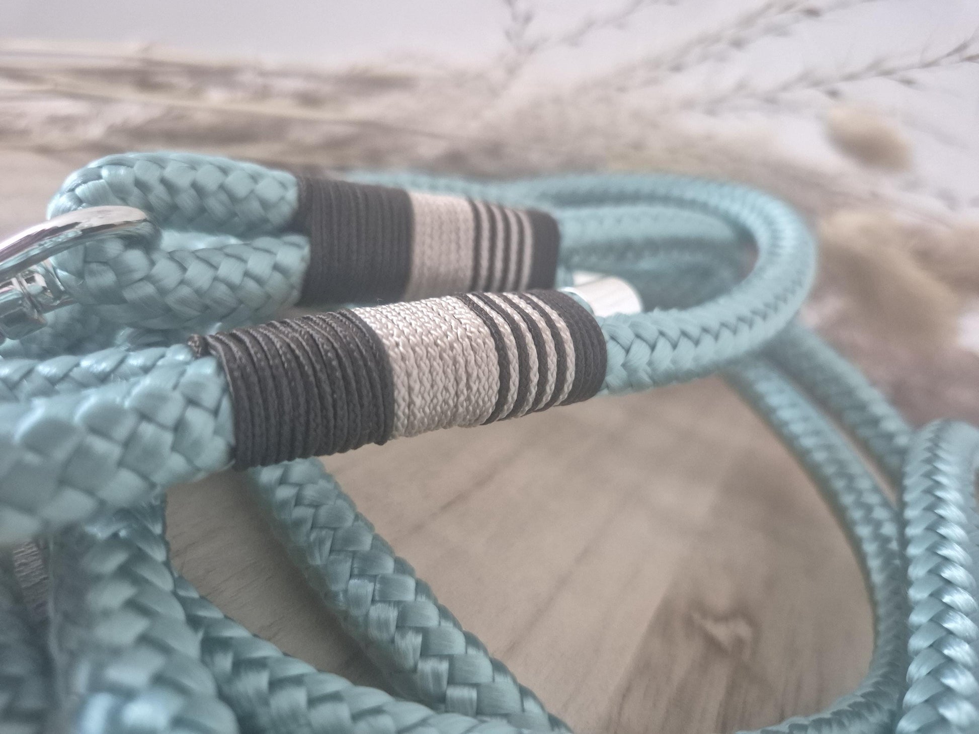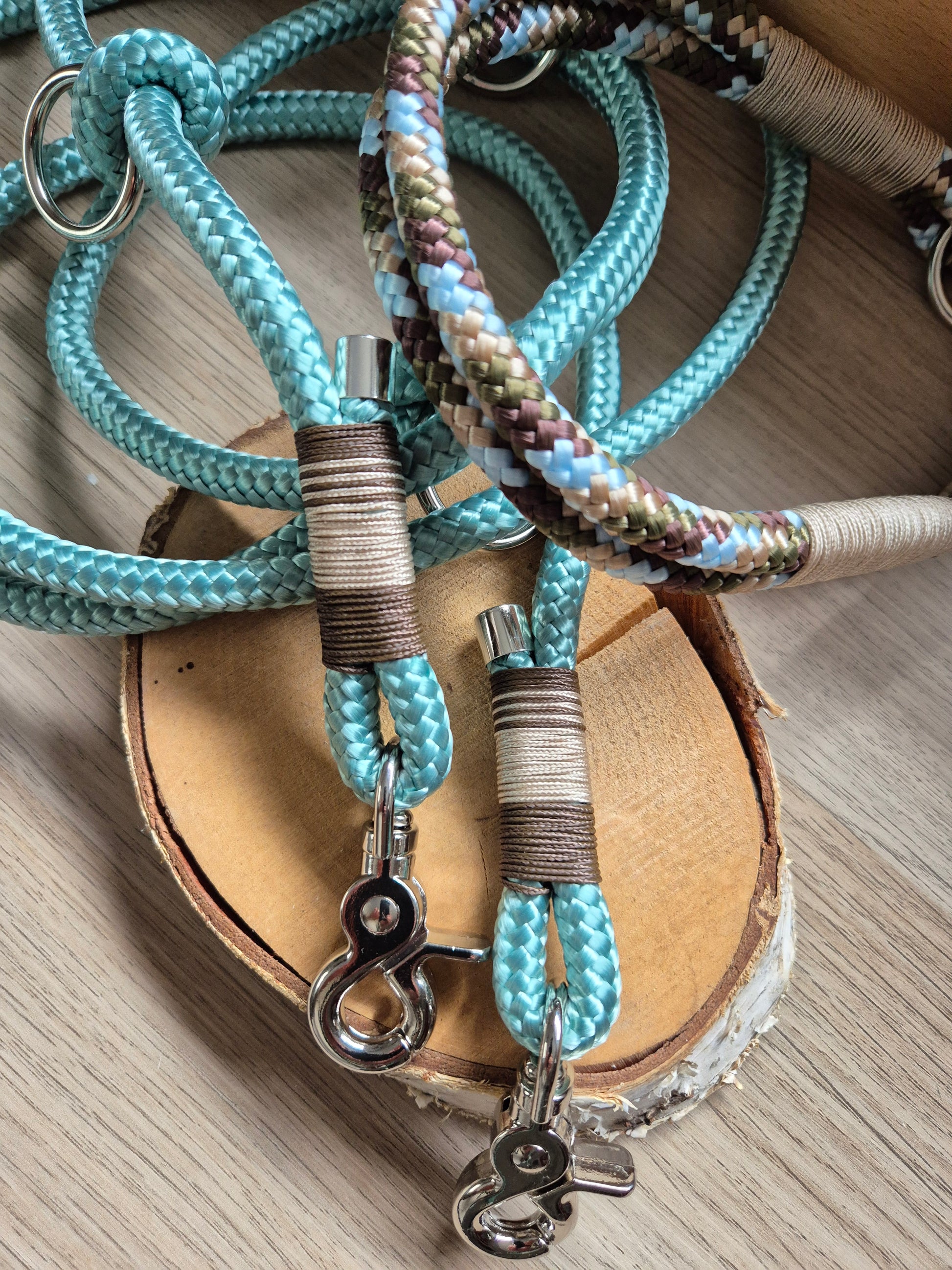 Das Set besteht aus Leine und Halsband aus Tauseil. Tau ist schön leicht und bietet dir und deinem Hund ein angenehmes Tragegefühl. Die dargestellte Leine ist 2,20 m - 2,30 m lang und lässt sich 3fach verstellen: