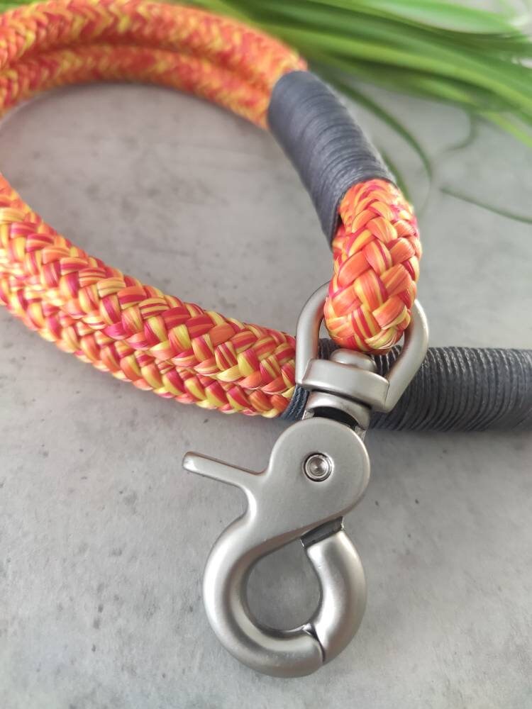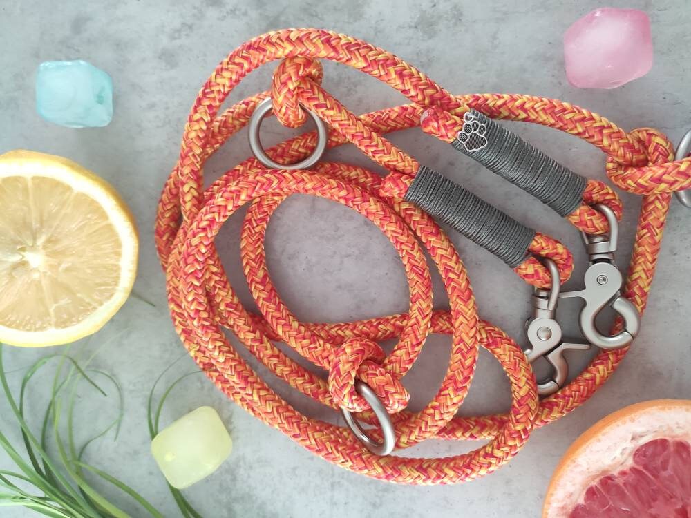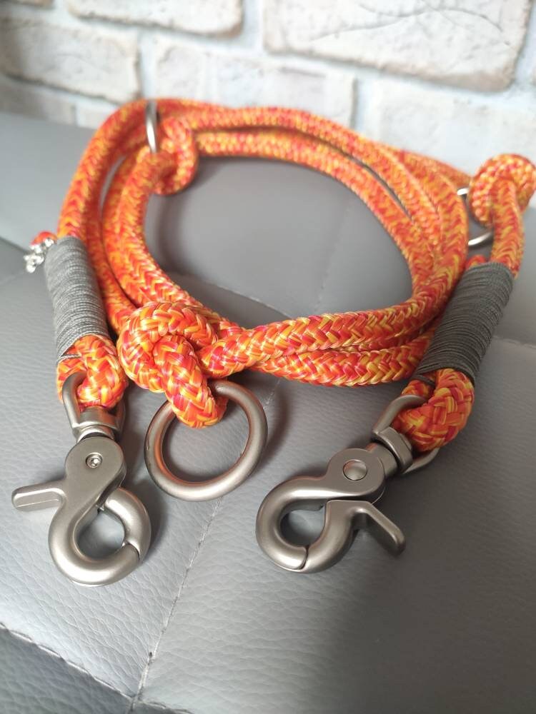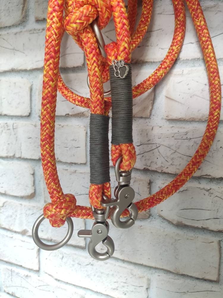 Das Set besteht aus Leine und Halsband aus Tauseil. Tau ist schön leicht und bietet dir und deinem Hund ein angenehmes Tragegefühl. Die dargestellte Leine ist 2,20 m - 2,30 m lang und lässt sich 3fach verstellen:
